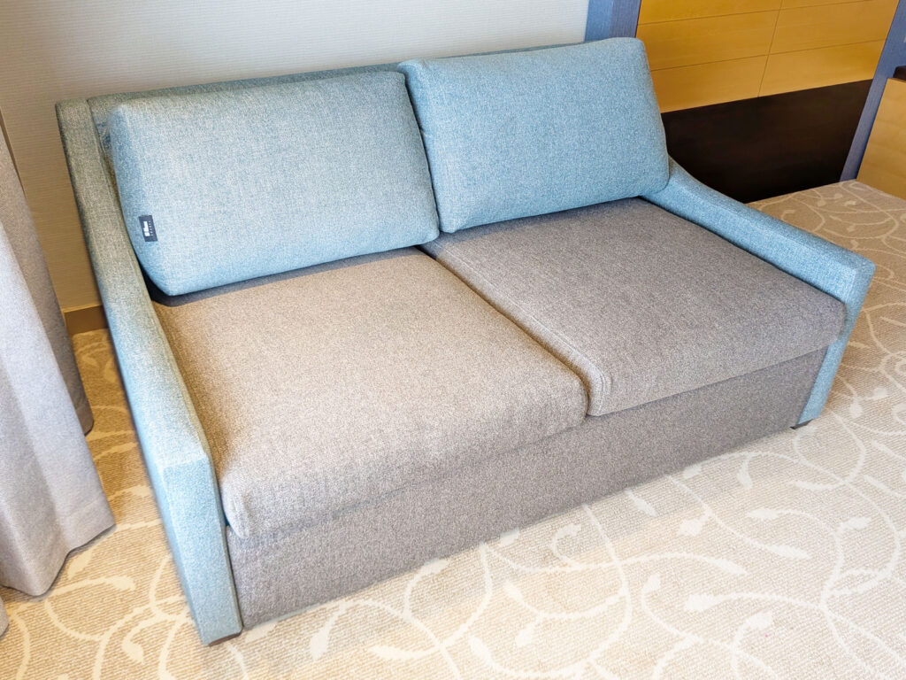 当施設のコンセプトである「海」を意識し、デザイナー指定の2トーンカラー生地と、幅狭にカスタマイズしたアームを採用しました。これにより、部屋の雰囲気に調和しつつ、セミダブルサイズの広々とした寝心地を提供できるようになりました。改修により上質な空間に生まれ変わった新しい客室に相応しい高級感のある設えも気に入ったポイントです。お客様に快適な滞在をお約束できると期待しています。