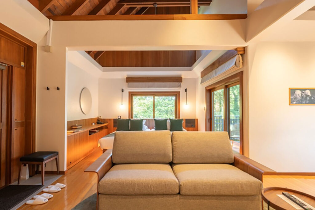 Sankara Hotel & Spa 屋久島様では、ホテルレストランショーにてSWANELのブースにご来場いただき、無垢材を使用した洗練されたデザインや、キングサイズを含む豊富なサイズ展開に高い評価をいただきました。これをきっかけにSWANELのソファベッド16台の導入、その後の改修工事においても各客室およびヴィラへの設置として10台の導入という形でご採用いただく運びとなりました。特に二階建て構造のヴィラでは、エキストラベッドの運搬が困難であることから、複数名でのご宿泊時においても快適にご利用いただけるよう、SWANELのソファベッドが活用されています。