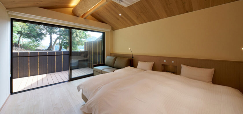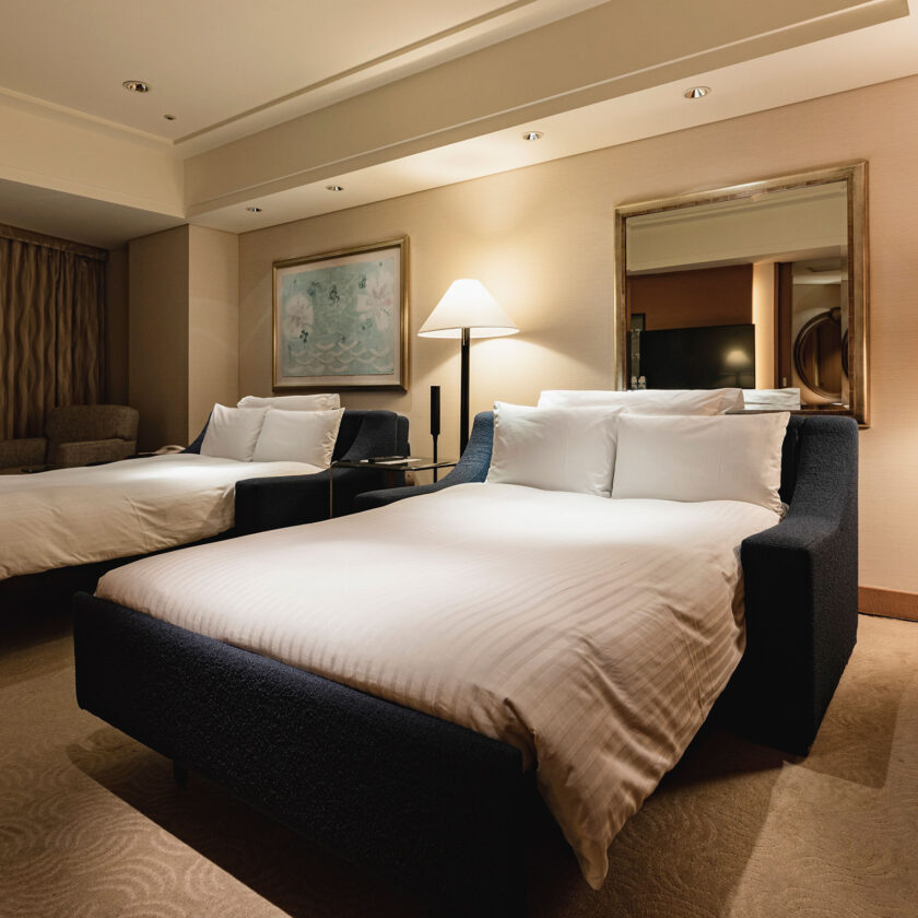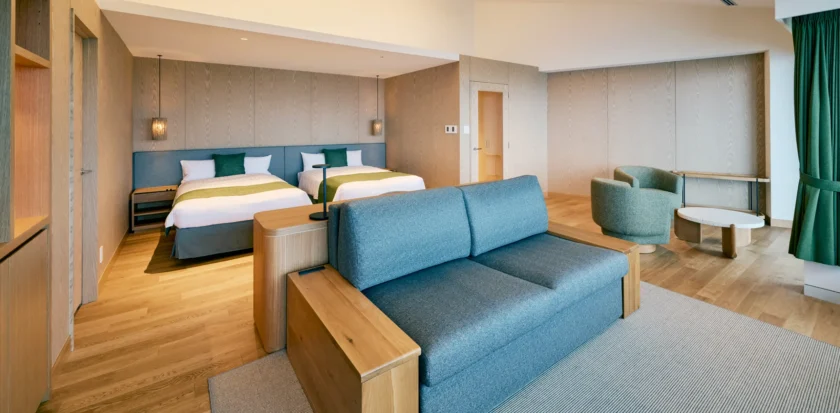 特にこだわったのは、2人掛け1台か1人掛け2台かの選択です。最終的に、ソファ利用時にはL字型でゆったりと、ベッド利用時にはI字型に動かすことで空間を広く使える1人掛け2台の配置が、客室の多様な表情を引き出し、お客様の様々なニーズに応えられると判断いたしました。