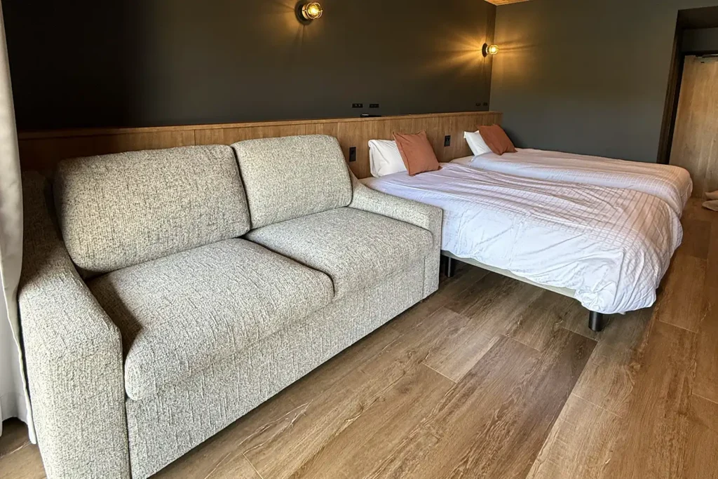 こちらのホテル様では、ジュニアスイートルームにて、他社のソファベッドを高い頻度でご活用されておりました。お部屋の改修に伴い、運用実績と品質をご評価いただき、SWANELソファベッドにてリピート導入いただく運びとなりました。